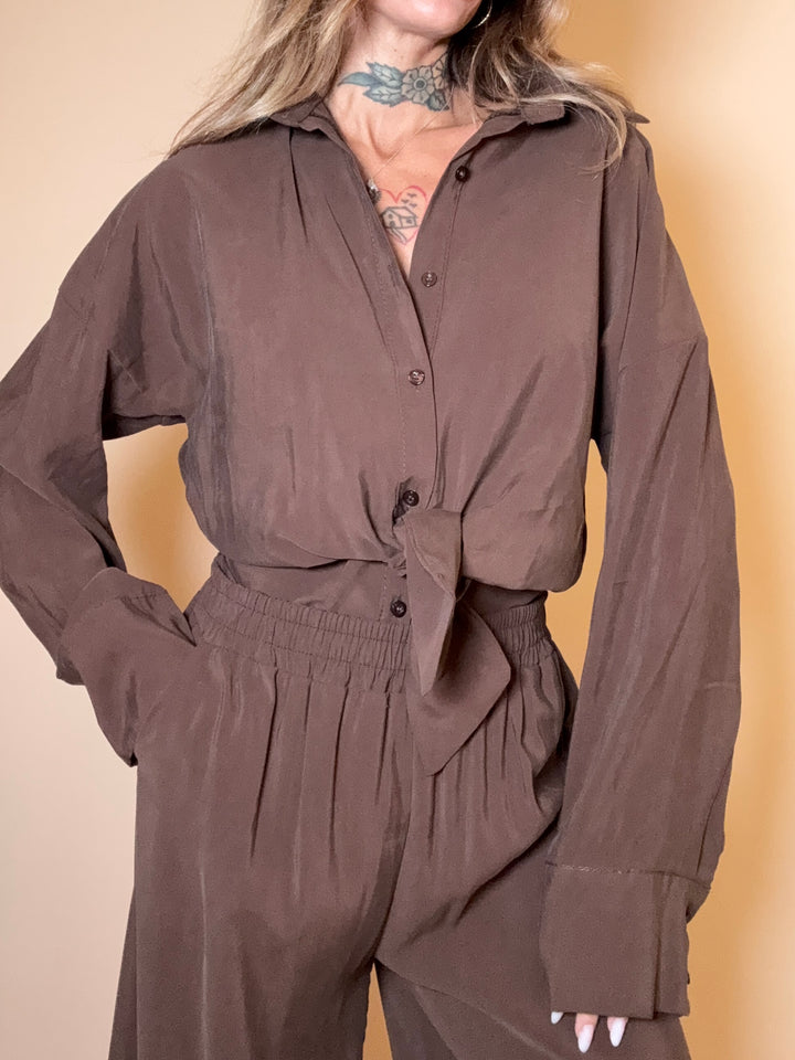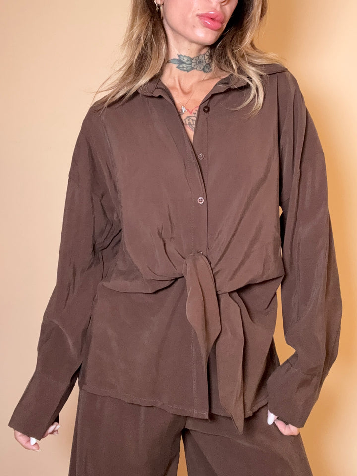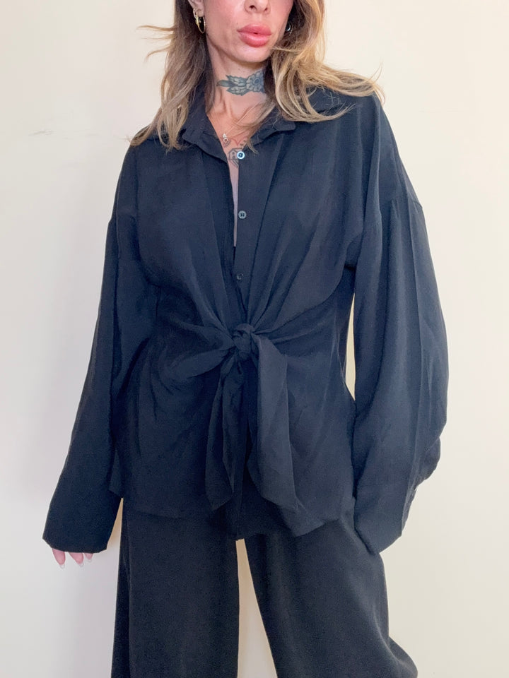 blusa morbida in tessuto scivoloso con nodo centrale. taglia unica