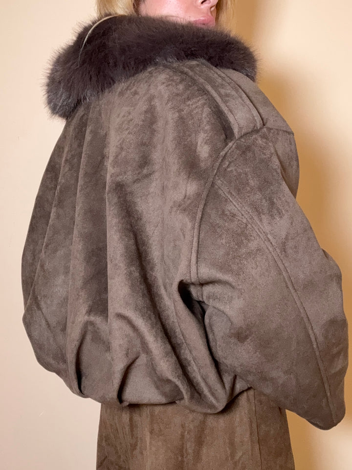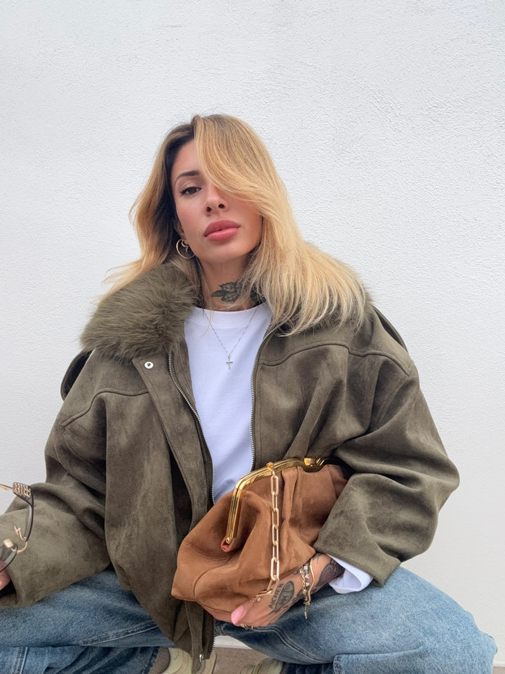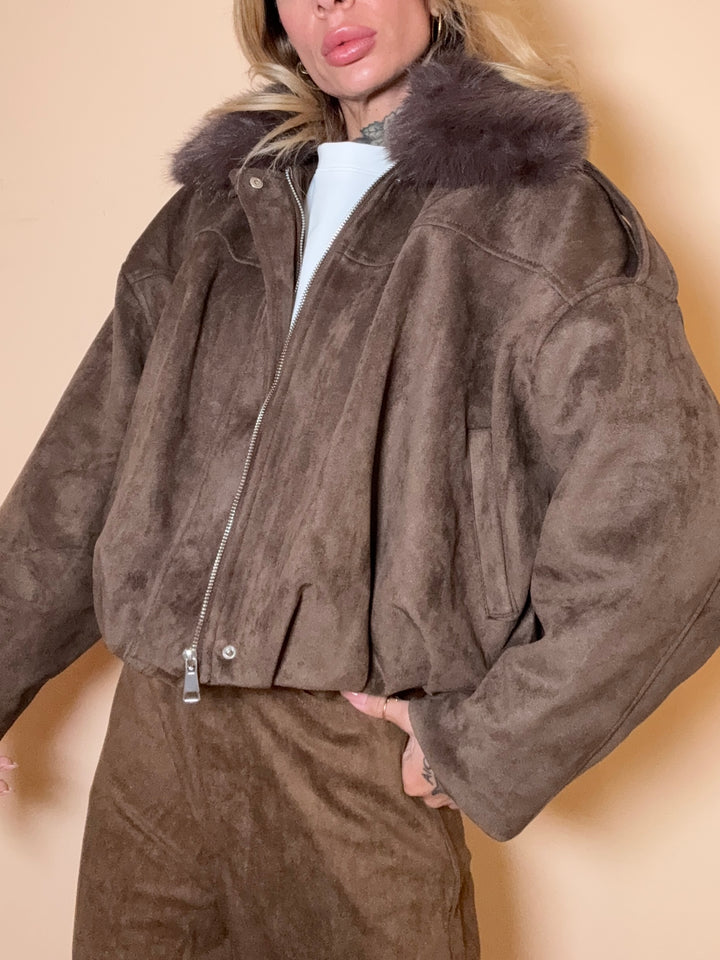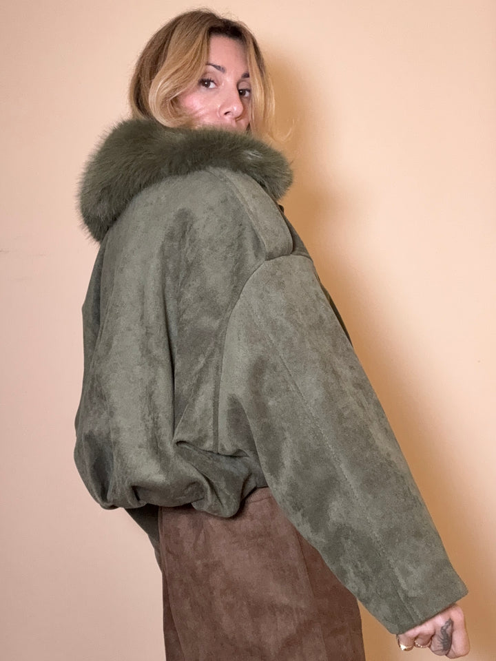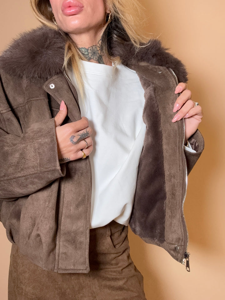 bomber in suede eco, imbottito all'interno e pelliccia sul