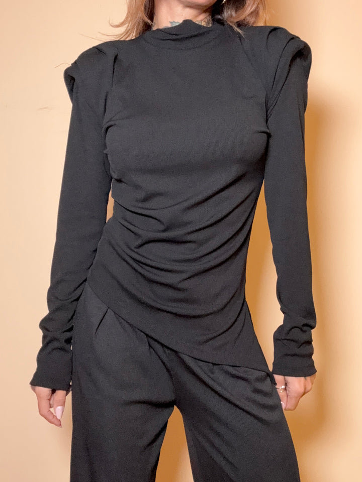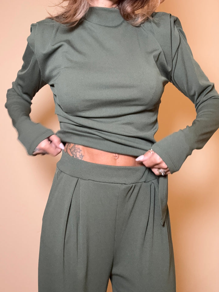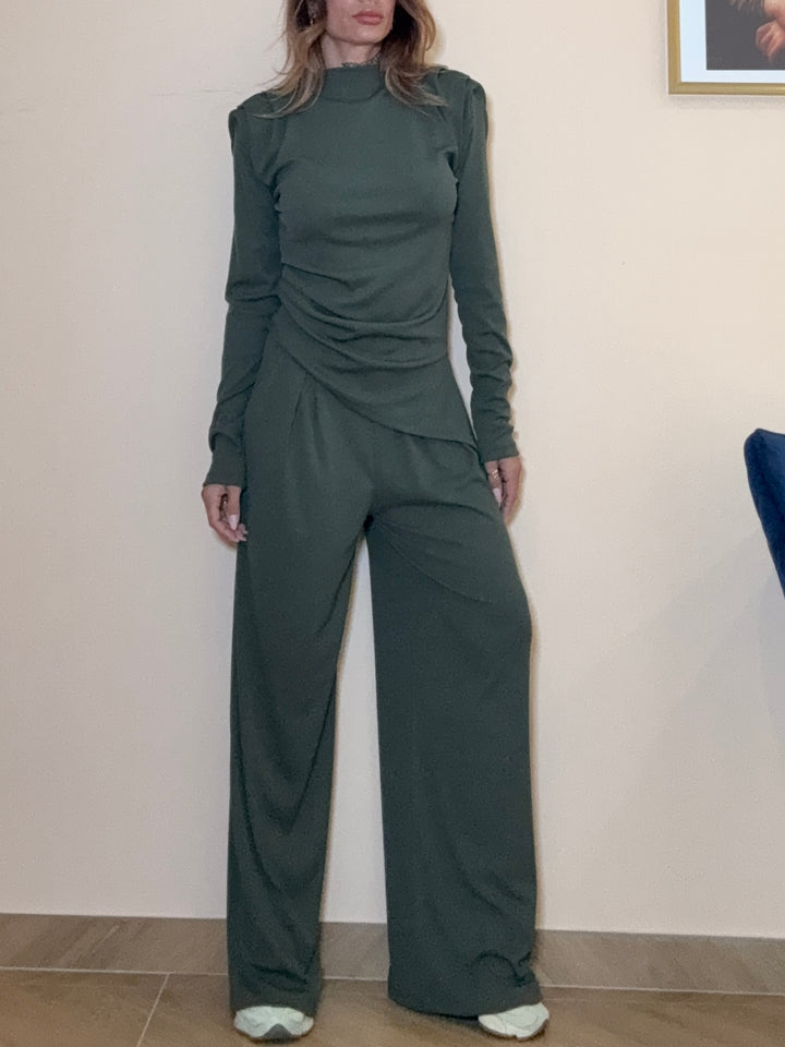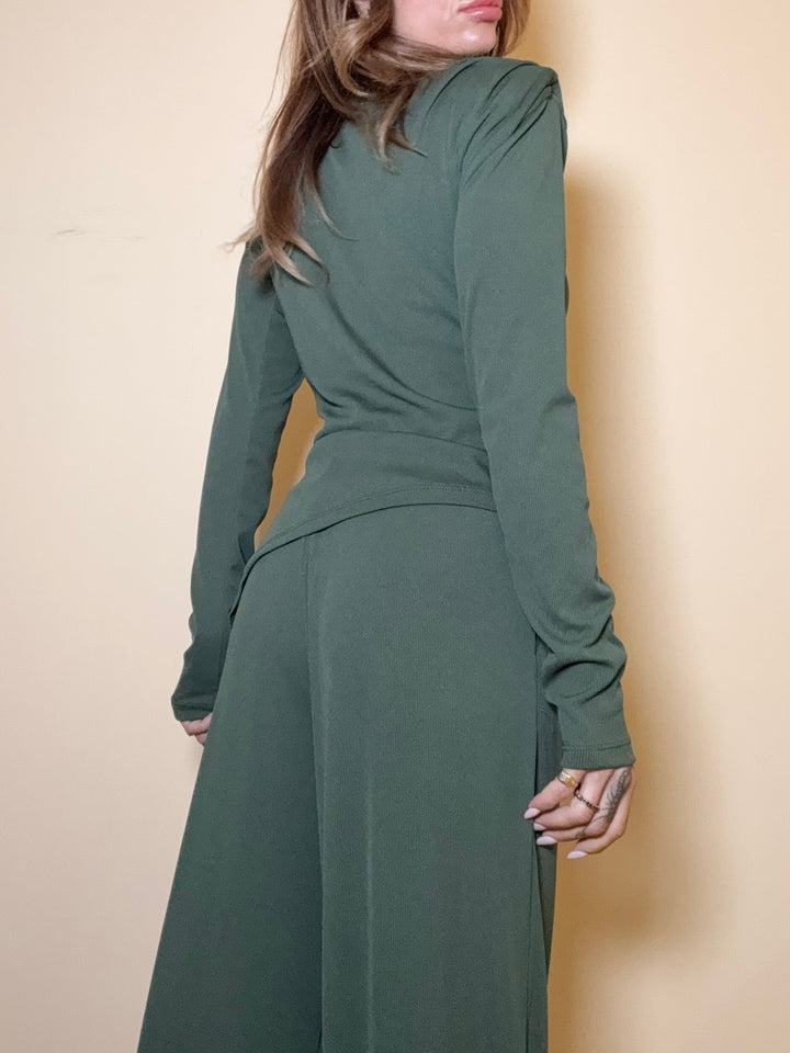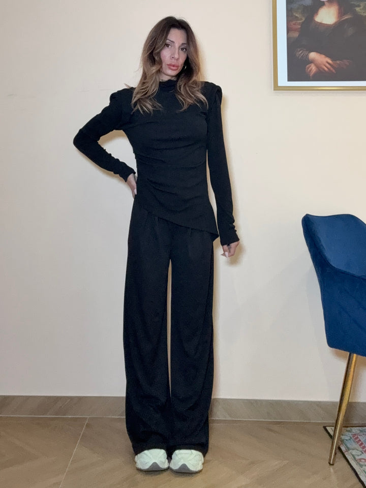 coordinato a costine in tessuto elastico: maglia asimmetrica con spalline; pantalone palazzo con elastico in vita. taglia unica