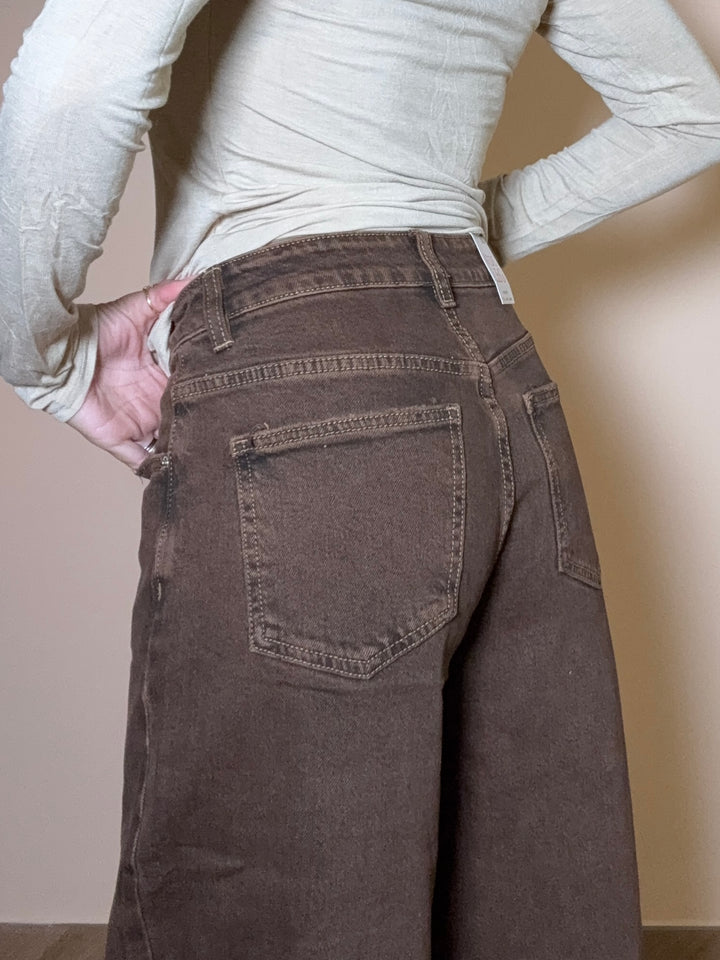 jeans in tela denim elastica: vita alta gamba palazzo; colore marrone bruciato. (in foto indossata la tg XS)