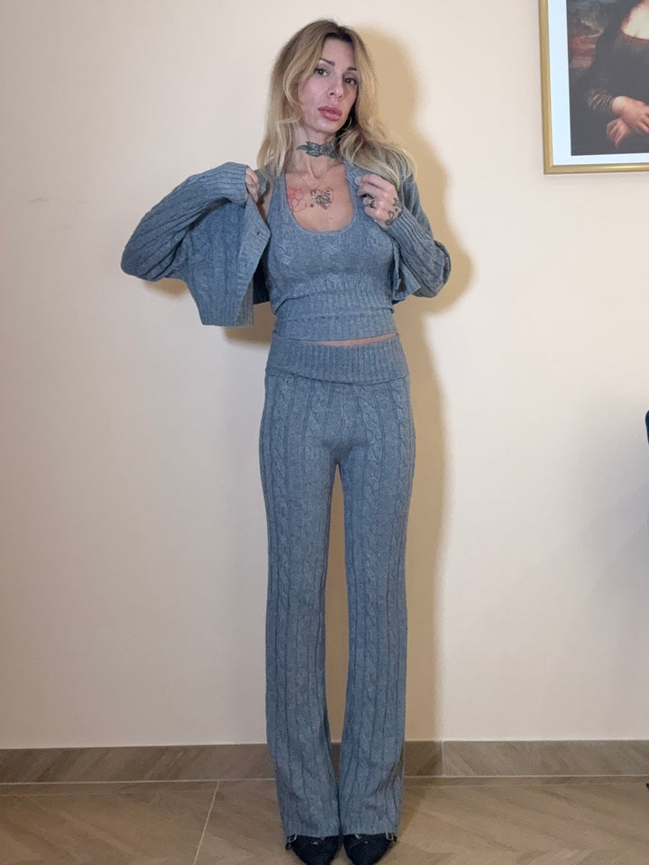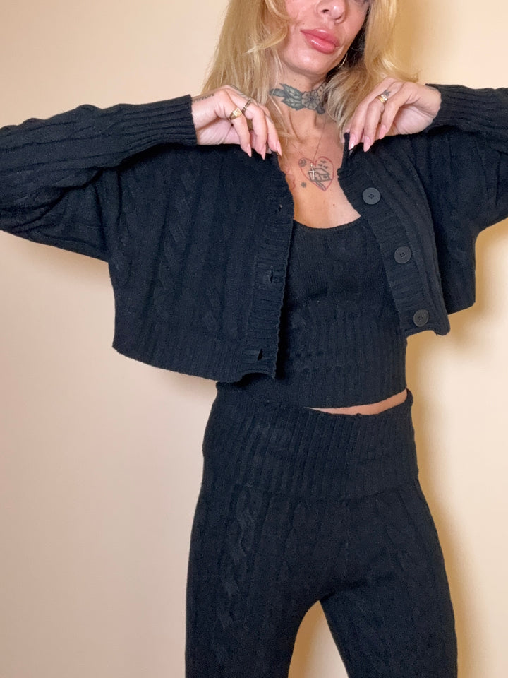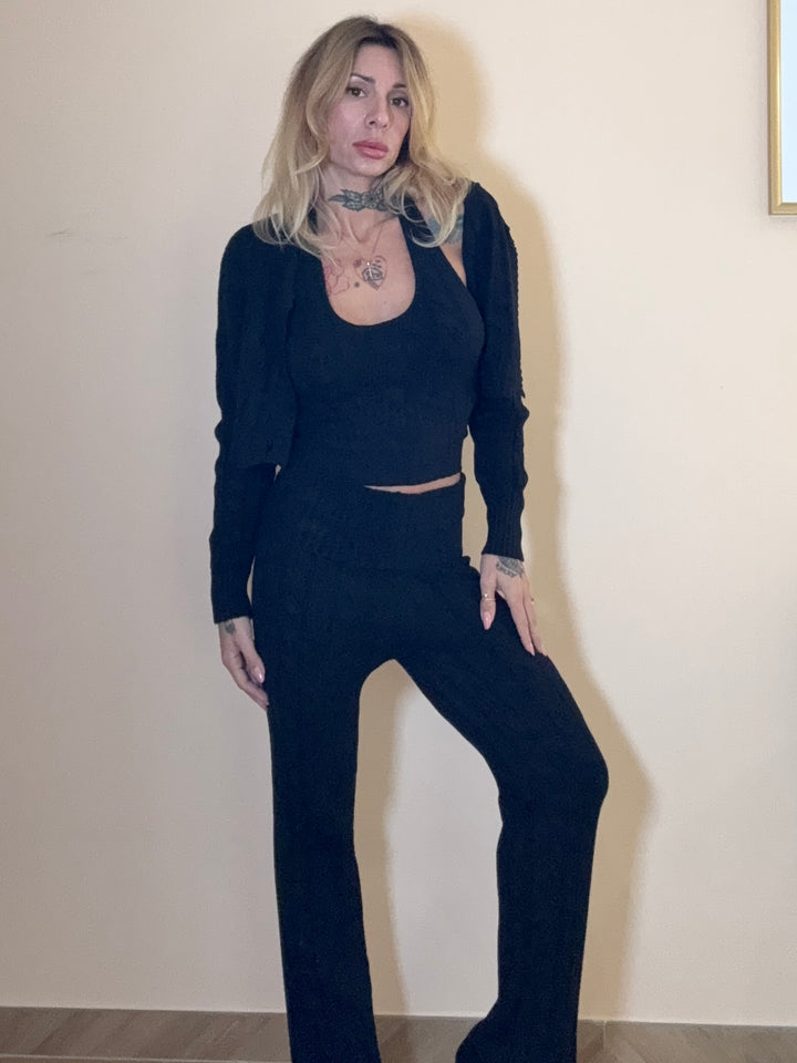 set in maglia elastica : pantalone palazzo , top e cardigan corto. in taglia unica