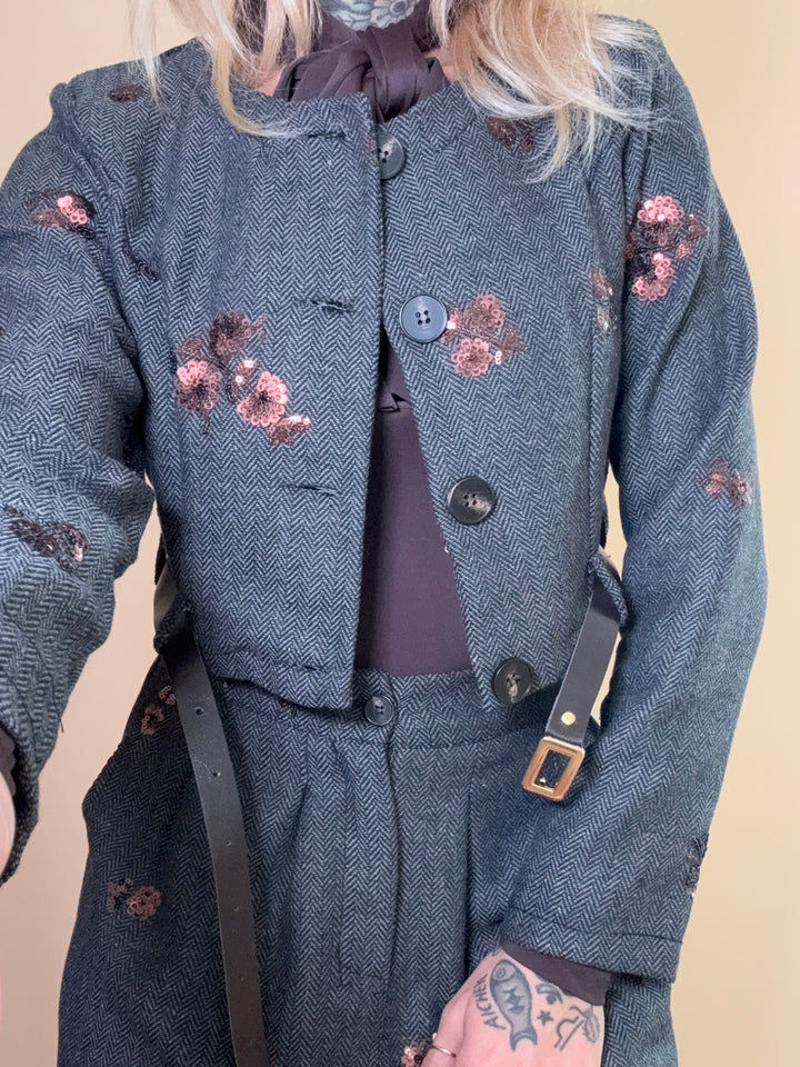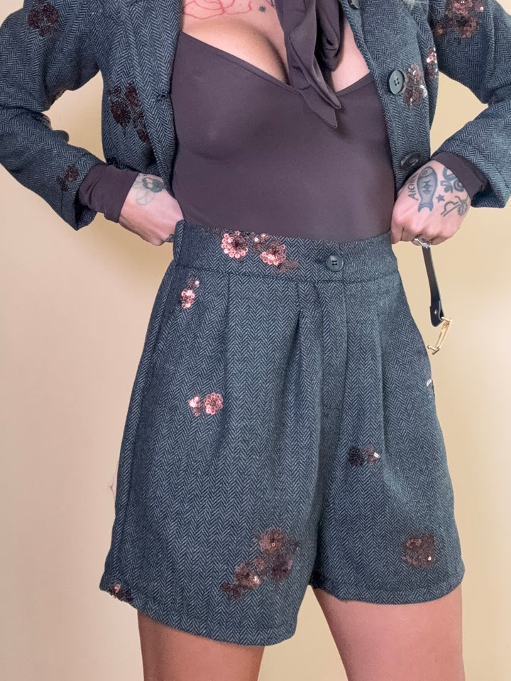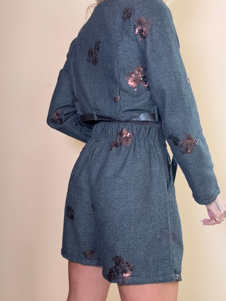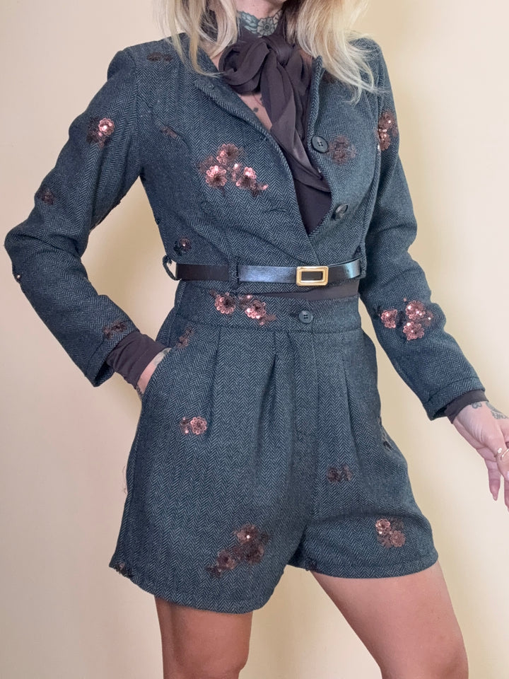 tailleur in tessuto spigato con applicazioni paillettes: shorts con pence ed elastico dietro; giacca corta con spalline e cinturino. (in foto indossata la tg S)