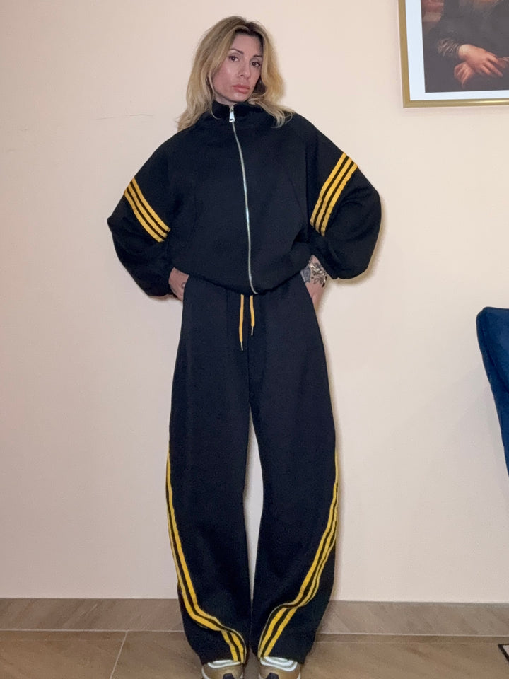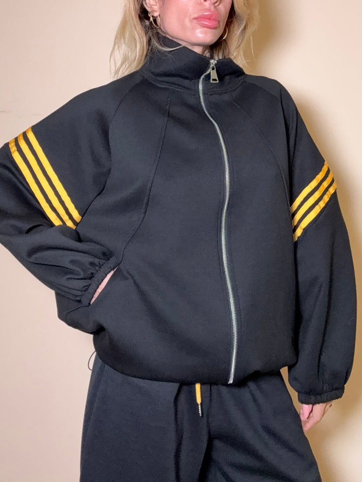 coordinato in tuta felpata ampio: pantalone modello balloon con elastico in vita; felpa con zip ed elastico sotto regolabile. taglia unica